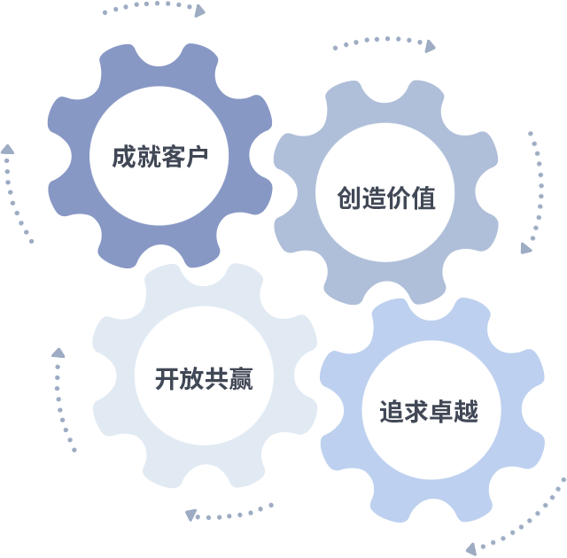 成就客户是一切决策的出发点,创造价值是衡量所有工作的标准,追求卓越是AG贵宾会做事做人的态度,开放共赢是AG贵宾会的格局也是最终的结果。价值观的齿轮环环相扣,推动着组织里的每个人不断向前。
